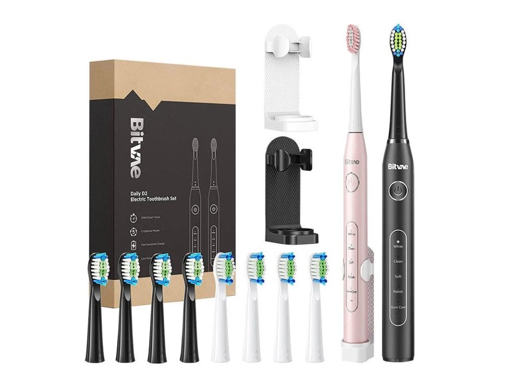 Súprava elektrických zubných kefiek s náhradnými nástavcami a 2 držiakmi na zubné kefky Bitvae D2+D2 (ružová a čierna)